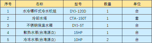 清遠皮革廠壓花機橡膠輥冷卻,通過工廠技術人員核算,需要配120HP水冷螺桿式冷水機組2臺,客戶直接百度水冷螺桿式冷水機找到東躍進制冷,通過幾天的電話及文字溝通確認,最終訂購2臺120HP水冷螺桿式冷水機組以及輔助設備,型號及數量如下表: